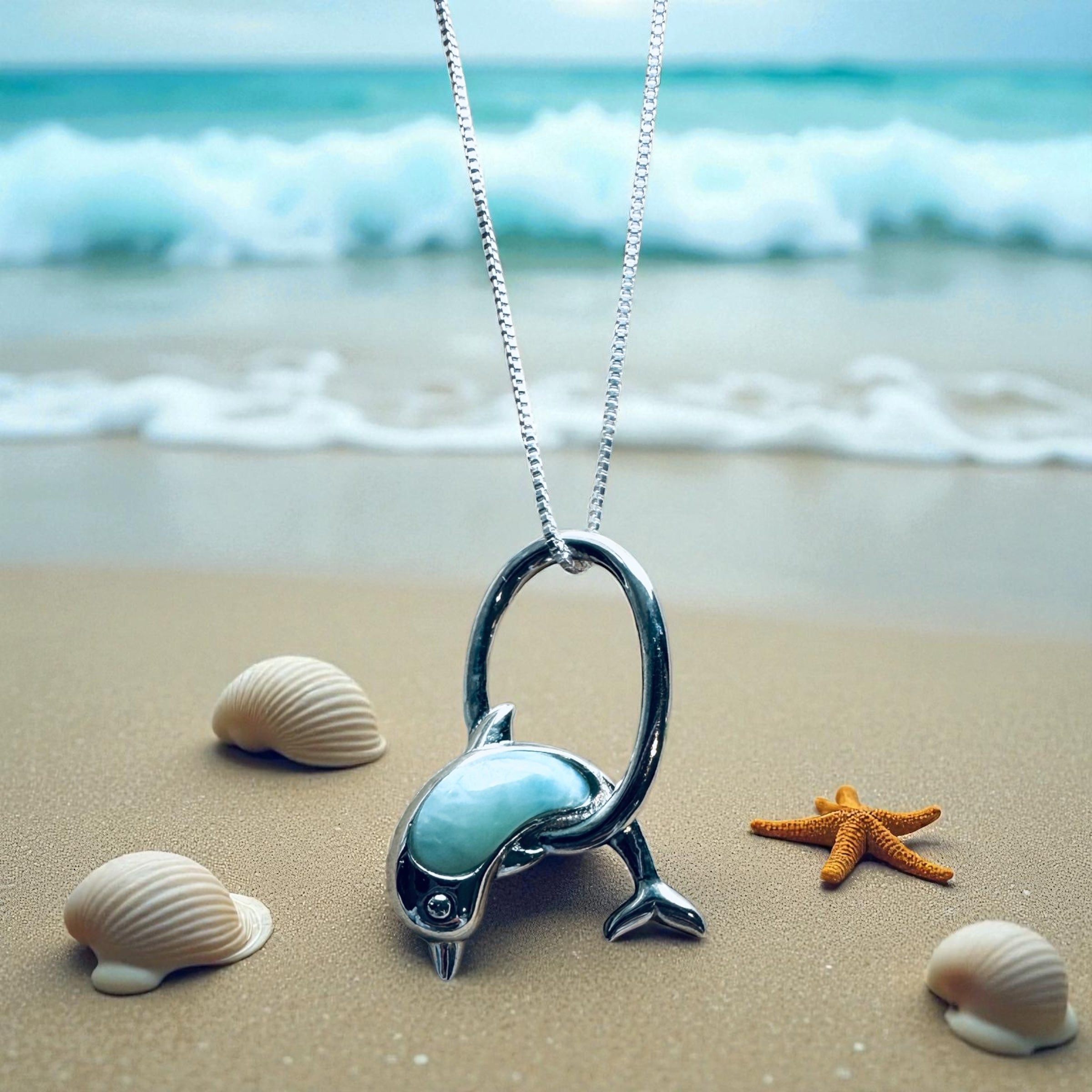 .925 Sterling Silver Larimar Stone Dolphin Pendant Necklace