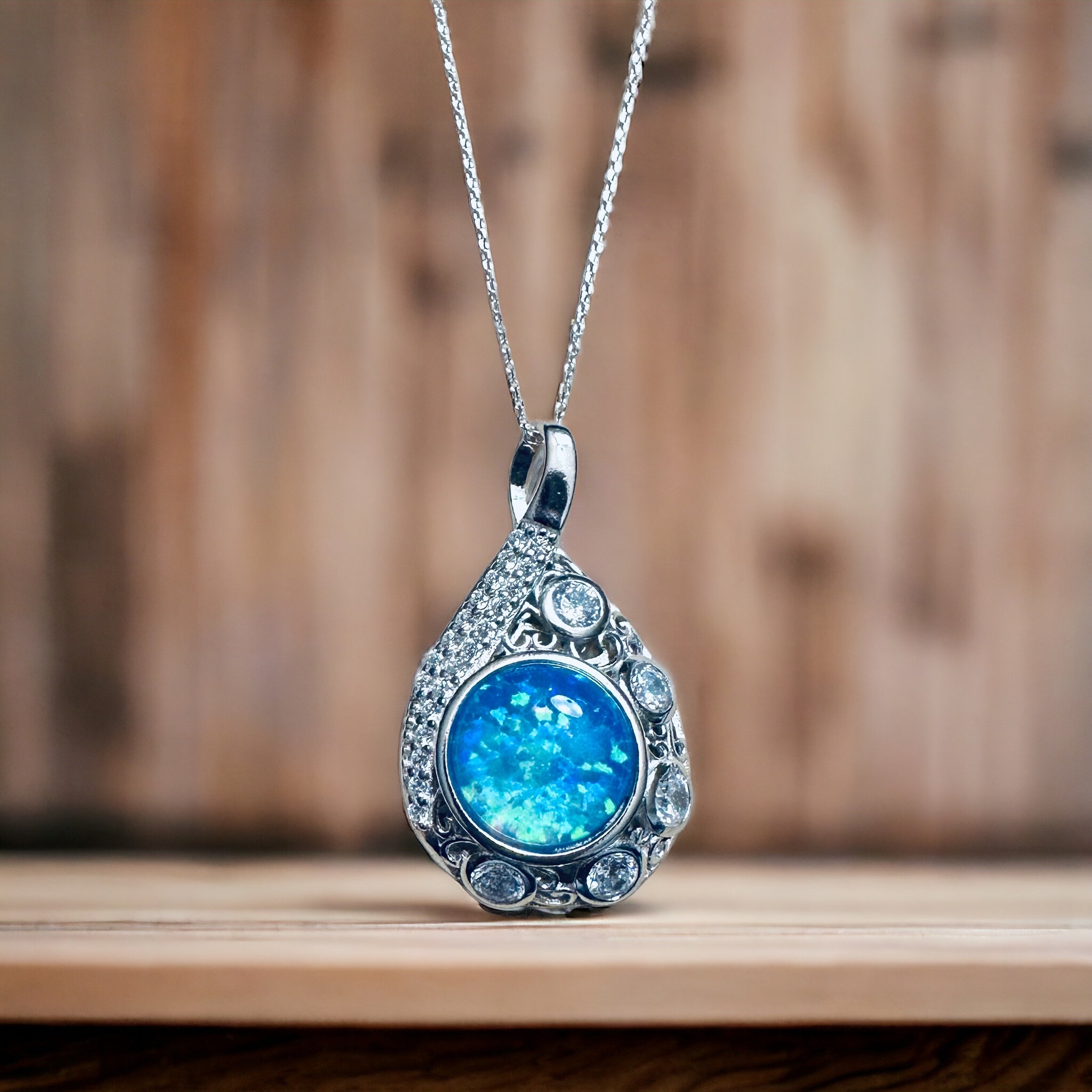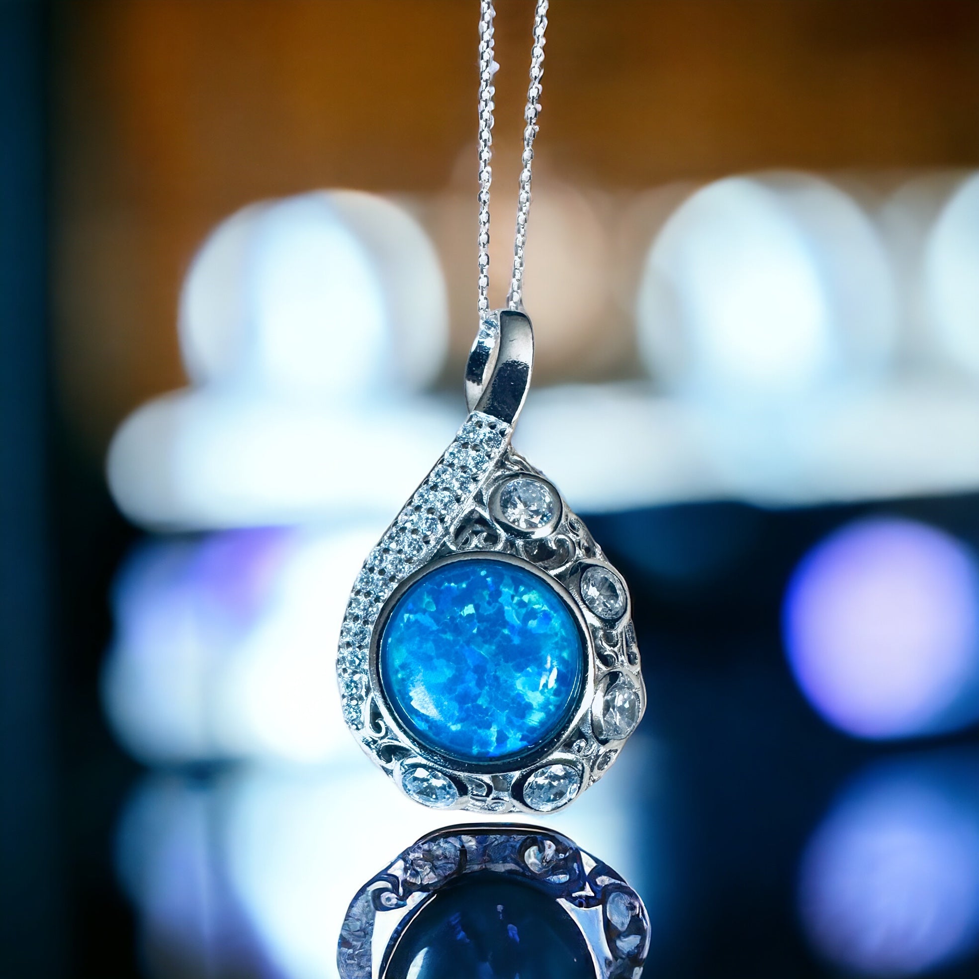.925 Sterling Silver Large Statement Lab Fire Opal Pendant Necklace